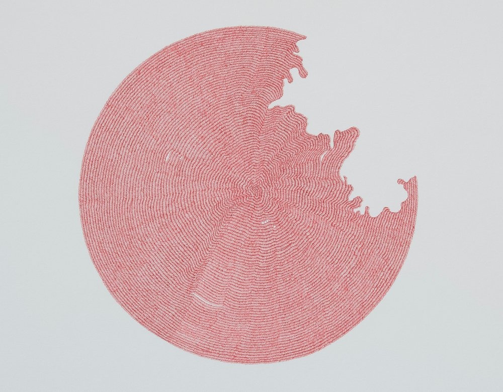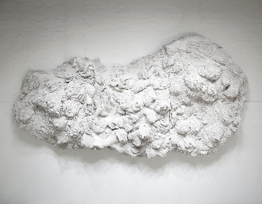 It is delightful that there are two finalists from China in this year's Prize. One of them is Fanglu Lin, whose work employs the traditional techniques of tie-dyeing from the Bai minority group in Zhoucheng Village, Yunan, China. This immense wall installation was built over three months of repetitive and scrupulous knotting, stitching, folding and pleating of white cotton cloth into intricate patterns. This enveloping, cloud-like structure is Lin’s tribute to the Bai women and their continued use of this labour-intensive 1,000-year-old technique.