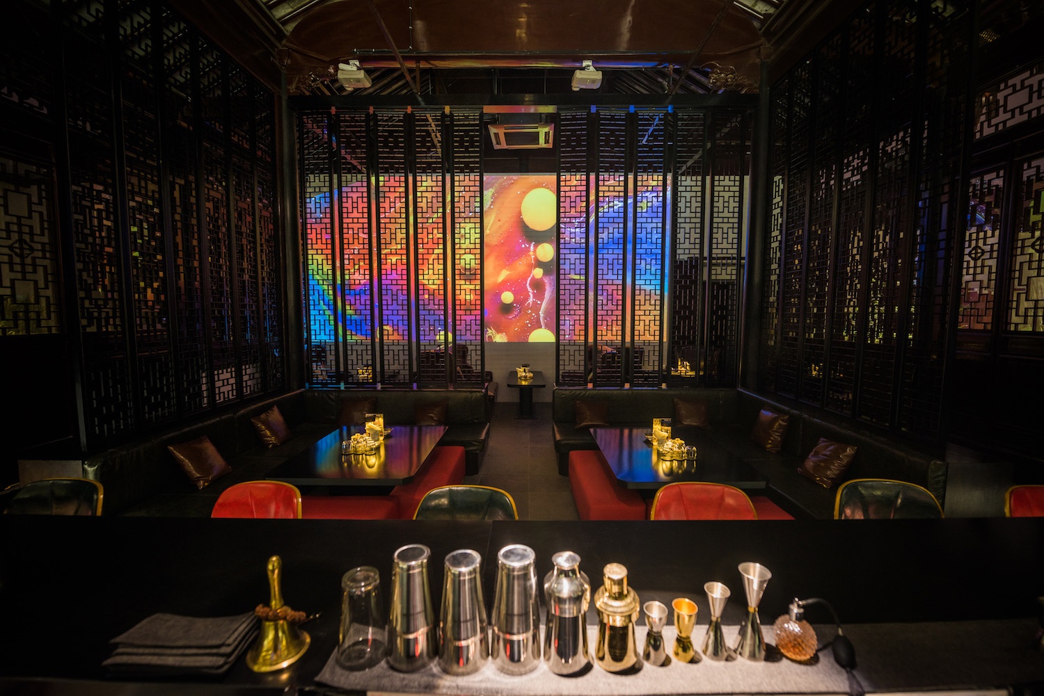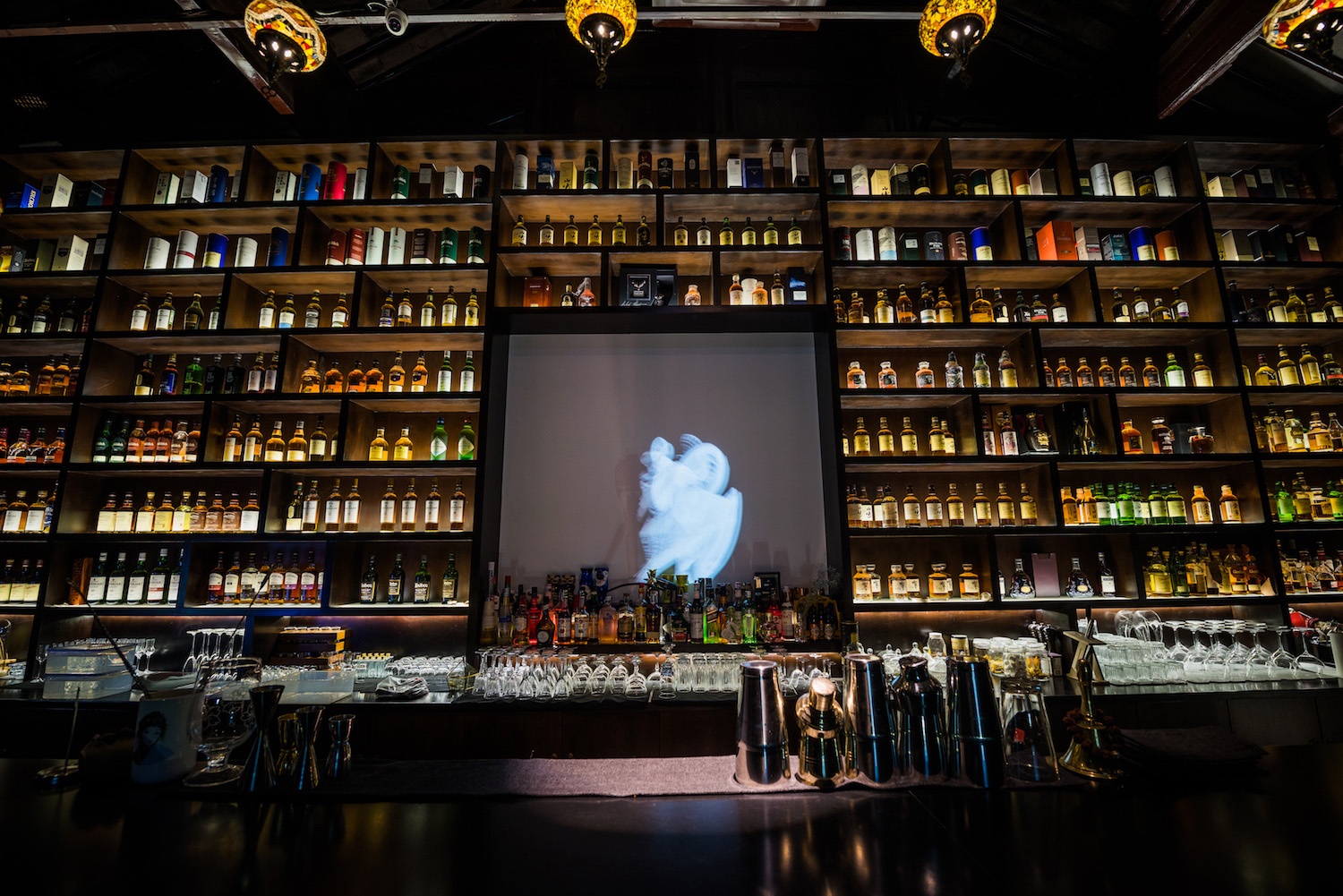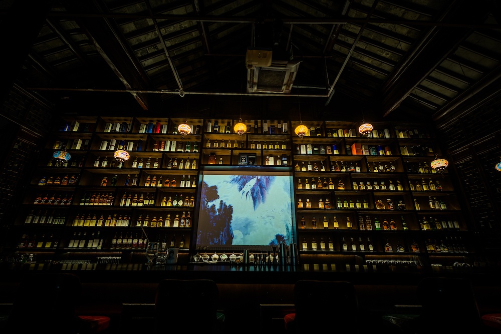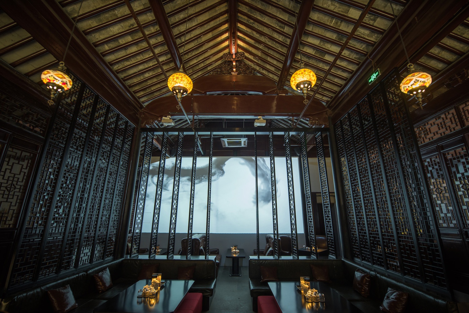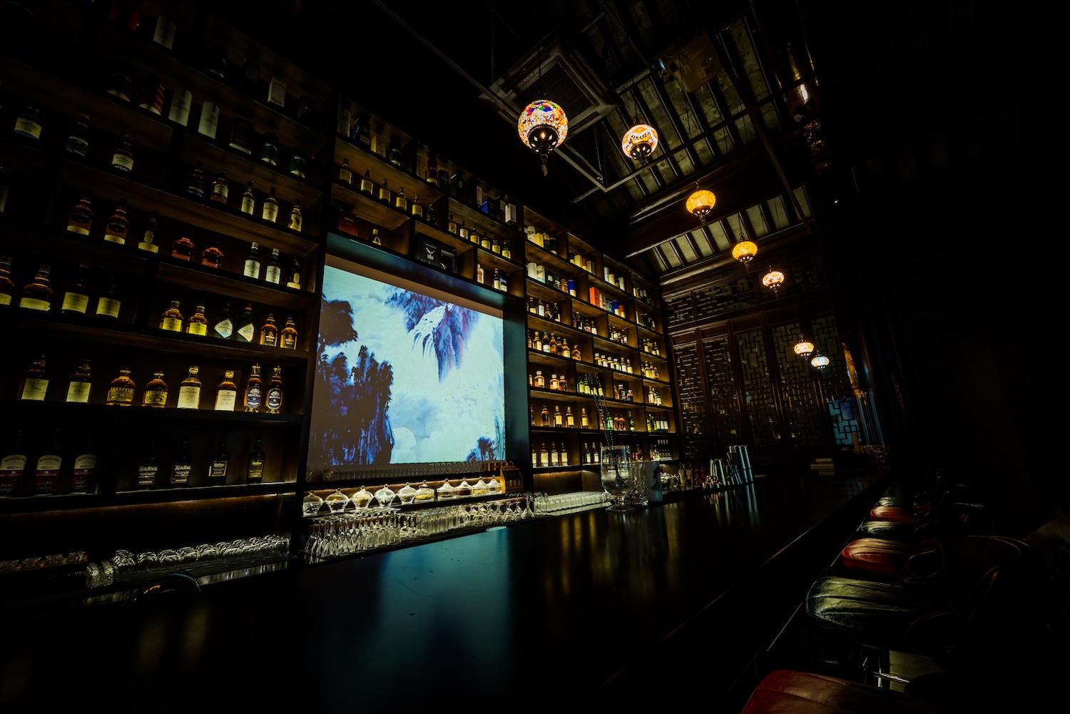 A series of curated pictures of Chinese paintings and calligraphy are projected onto space in the middle of the wine cabinet, as well as the massive white wall on the other side of the bar. Instead of the traditional way of hanging physical artworks, the modern technology benefits viewing in the darker environment of a bar, while promoting Chinese art culture in the adequate atmosphere.