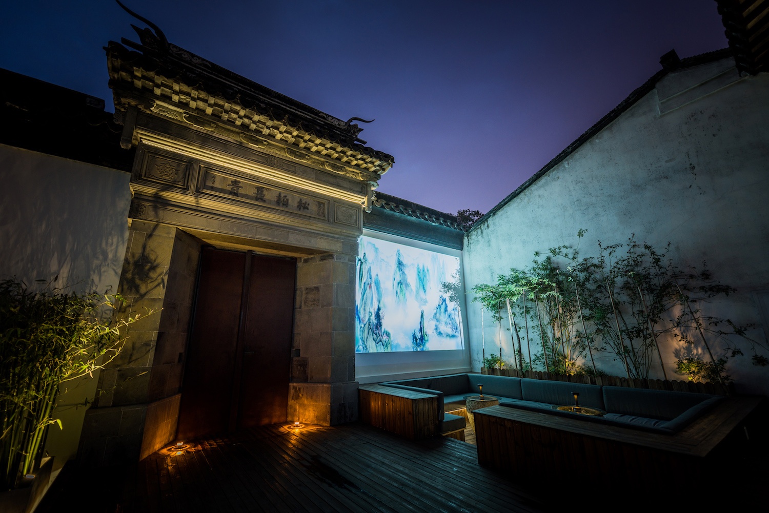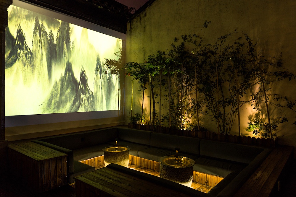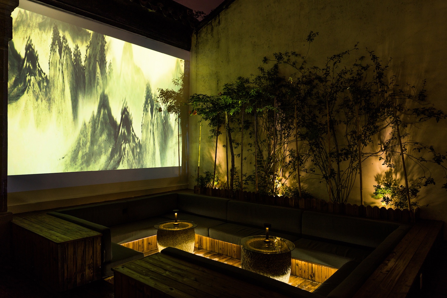 The courtyard has not been changed much. Li planned a green wall, but it has not revealed its full potential yet since the plants are still growing. There is another projection on the wall in the yard. Li said the environment would become very charming when it is raining, having drinks in hand and jazz playing in the air.