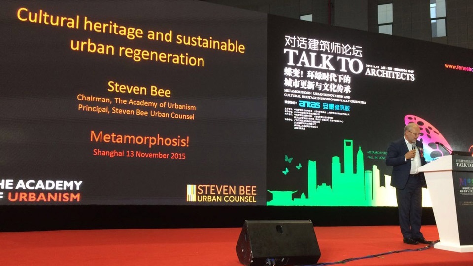 The China Design Centre put forward Steven Bee as the keynote speaker at the ‘Talk to Architects 2015’ conference in Shanghai on 13th Nov. Held at Shanghai National Conference and Exhibition Centre, the conference’s theme was ‘Metamorphosis: Urban Renovation and Culture Heritage in an Era of Sustainability’. Steven Bee is the Chairman of The Academy of Urbanism, and the Principal of Steven Bee Urban Counsel.