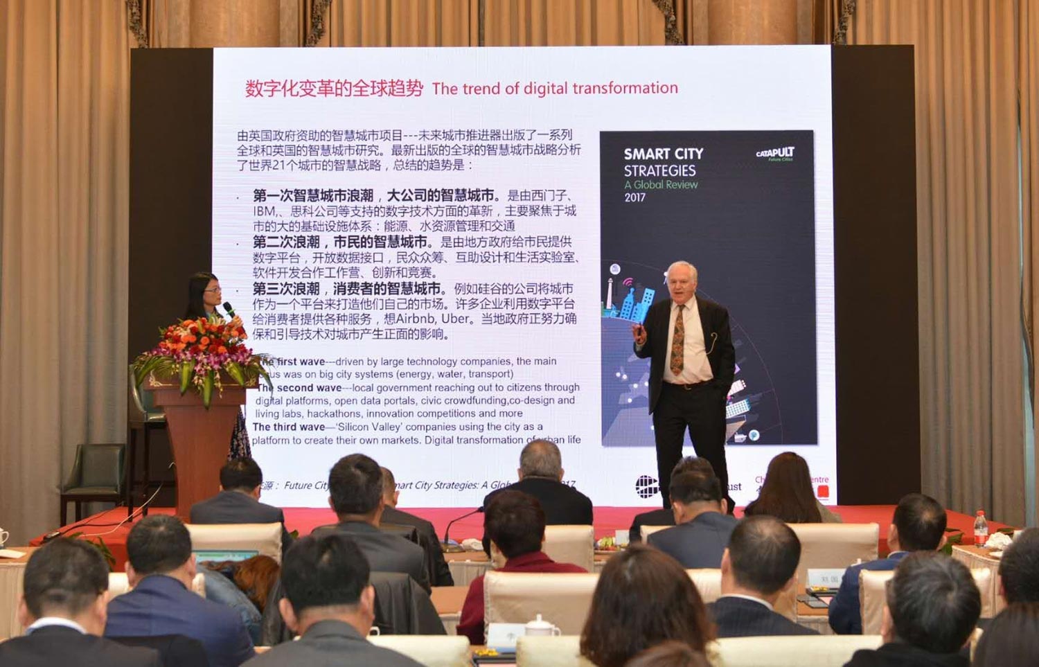 Dr. Nicholas Falk presented ‘Building Real Smart Towns for People’ , and explained why China need smarter urbanization in this fast growing stage and new town development. He uses six case studies: Copenhagen, Singapore, Freiburg, Vienna, Grenoble and Cambridge, to explain where smart technologies can add value. Then, he examined different hard and soft technologies and the application on enhancing the management of infrastructure, transport, healthcare, shopping street and education. He stated that despite the fast-developing technologies, we should always aim for 'good cities and better lives'.