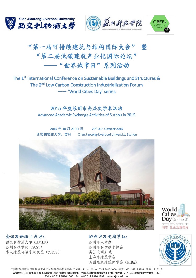 In response to this, Xi’an Jiaotong-Liverpool University (XJTLU) and Suzhou University of Science and Technology (SUST), together with Chinese Built Environment Experts (CBEEs), plan to hold the ‘1st International Conference on Sustainable Buildings and Structures’ & the ‘2nd Low Carbon Construction Industrialization Forum’ in Suzhou on 29-31 October 2015. It aim to nurture an interdisciplinary Research&Development environment that can support innovation in the whole lifecycle of a green building. It also intends to found a high-end network to get the message across different stakeholder groups (e.g. governments, industries, enterprises, academia, R&D and other relevant stakeholder groups) and thereby facilitate cross-departmental collaborations. We hope this early initiative could drive the current/future urban and rural development towards sustainability standards from an integrated perspective.