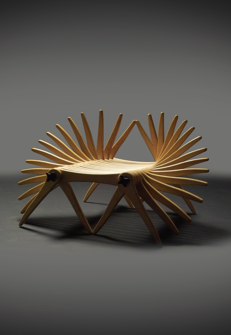 “这个设计是源自对设计逻辑的探讨。主题是设计可变形,可叠加,多功能,适合大批量生产,模块化,可延展,平板包装,人体工学等8项限制的家居用品。事实上是试图将工业化产品和个性化产品的大部分属性强加在一个‘东西’上面,因为它既不是产品也不是作品。其过程是意外的,并没有因为限制的严格而导致设计的滞障,反而非常迅速的得到了上面的结果。这好比一个多重条件的交集,精准而理性。让我感到的是极端的逻辑之美。极多造型制造的感性与极简模块制造的理性完全融合成为这只孔雀。这是我最早期的家具设计之一,幸亏它一直没有飞起来。”