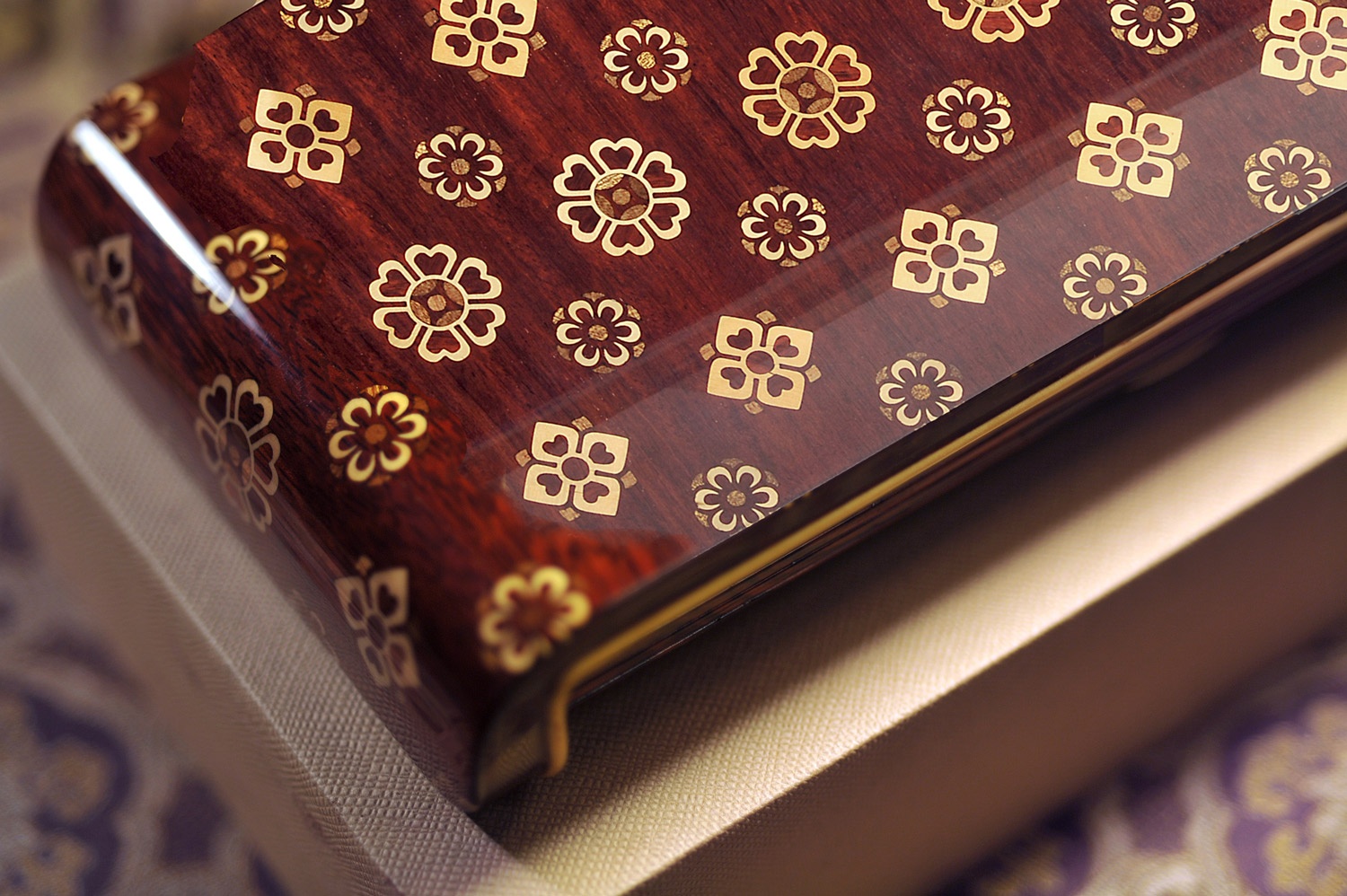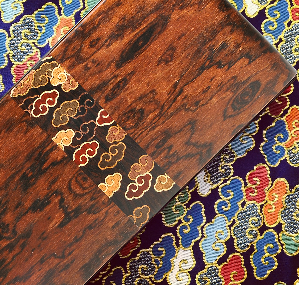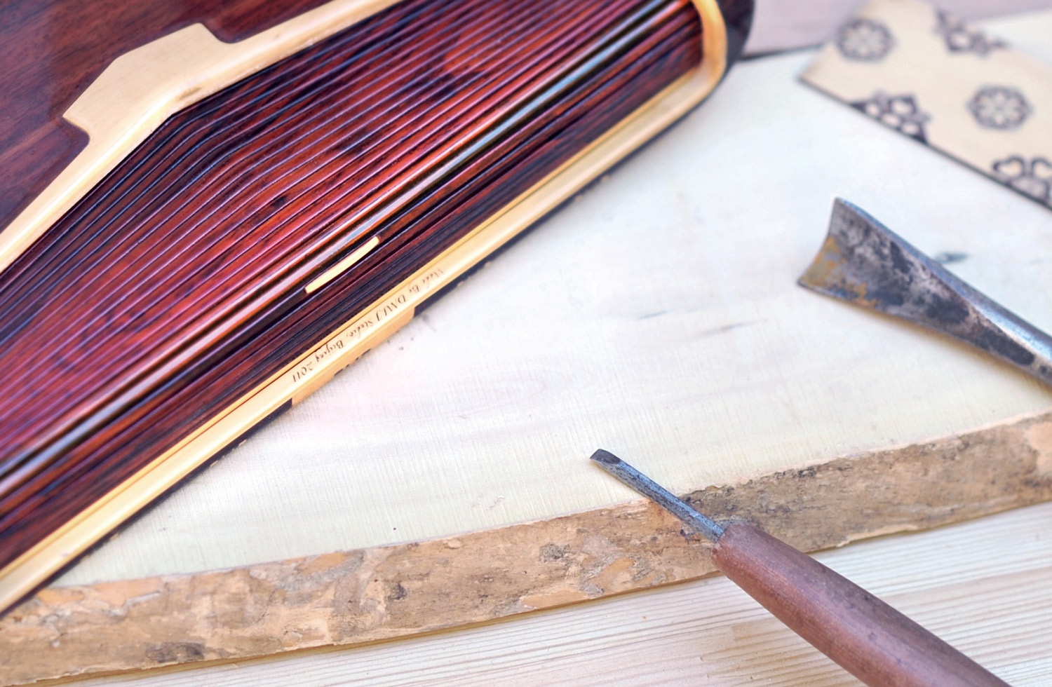 将最细小的磁石藏在木质里面,用看不见的方式完美吸合,再用文火将硬木一点点烤弯塑形。细心描摹唐代琵琶上的镶嵌,找来日本京都作坊里出产的锦缎做内衬。