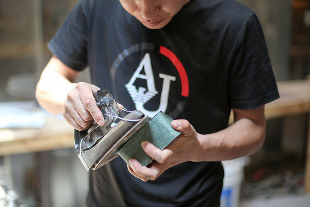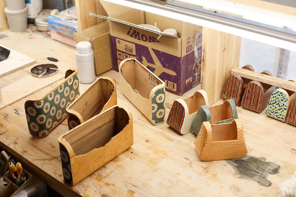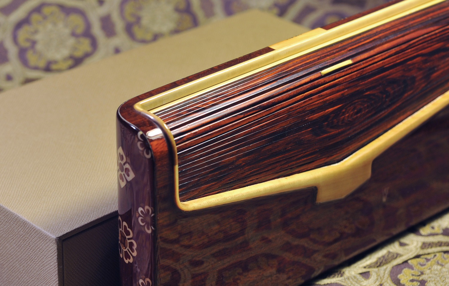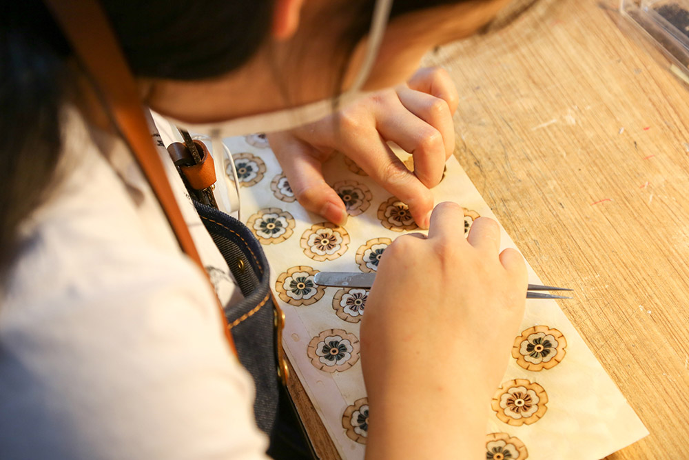将最细小的磁石藏在木质里面,用看不见的方式完美吸合,再用文火将硬木一点点烤弯塑形。细心描摹唐代琵琶上的镶嵌,找来日本京都作坊里出产的锦缎做内衬。