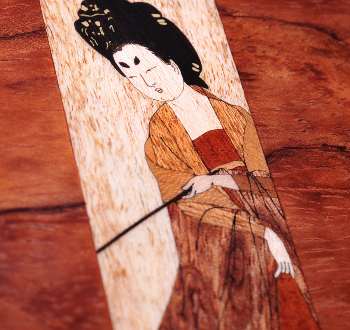 九种天然木色,临摹出周昉的名作簪花仕女图。古夷苏木瘿的朵朵漩涡,如牡丹盛放在深红长袍上,随衣袂摇动。纱袍上半身采用荧光涌动的红影木,营造出曼妙的半透明感。而袍下露出水色衬裙,则以精心裁切的水曲柳影木,借木纹天然走势,模拟裙裾随步摇动之态。
