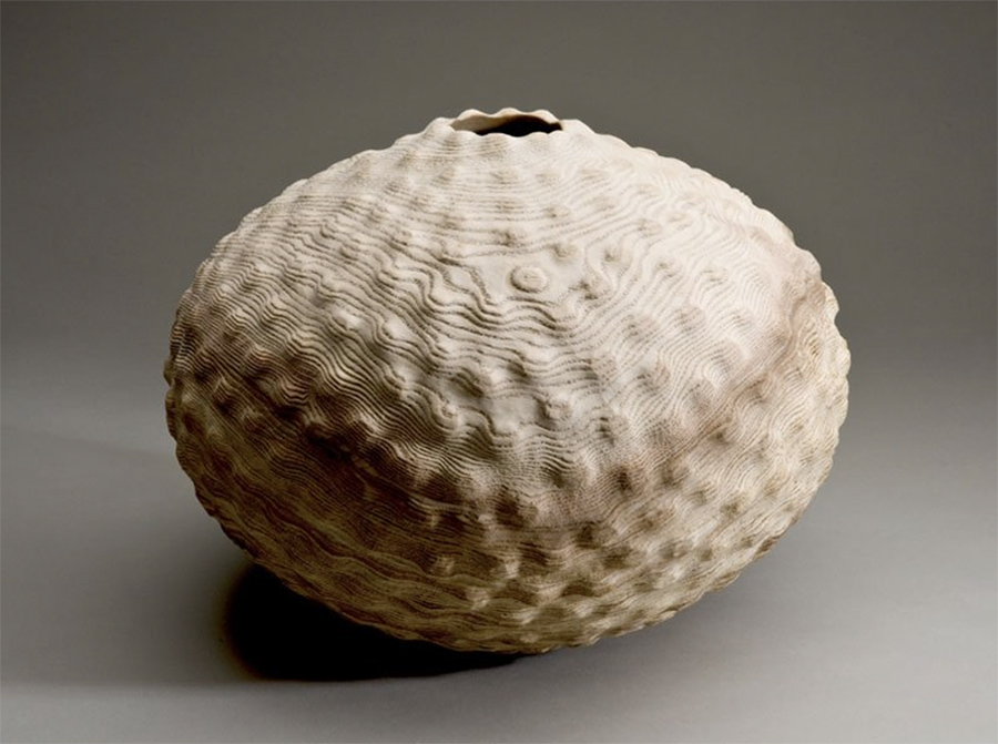 我剥离了树皮,揭示存在于材料内部的有机混乱,并通过雕刻和喷砂来建立纹理层。我用了器皿的形式和表面的图案来探索创造、衰败和腐烂之间的时间、层次和自然侵蚀。——Eleanor Lakelin