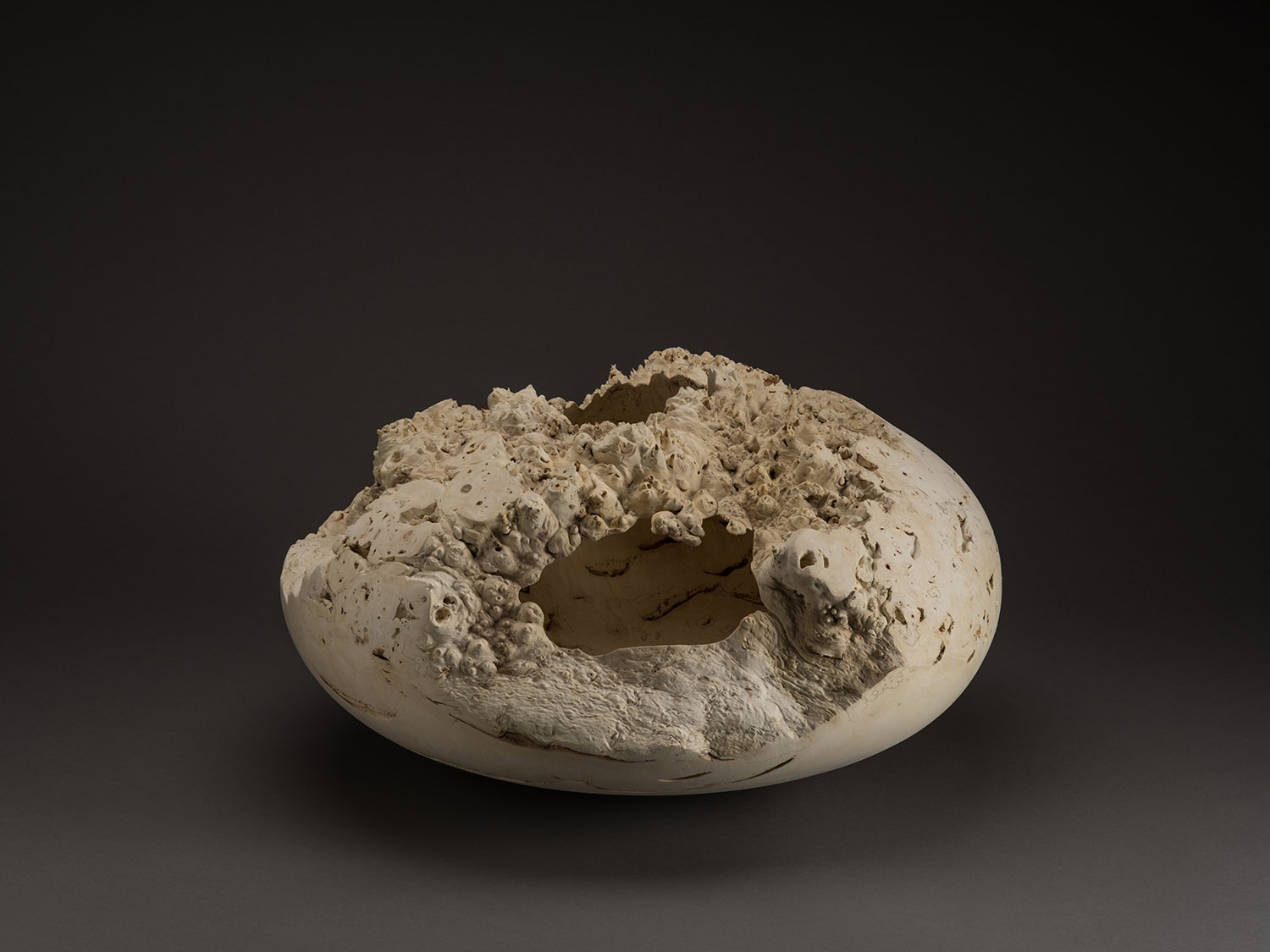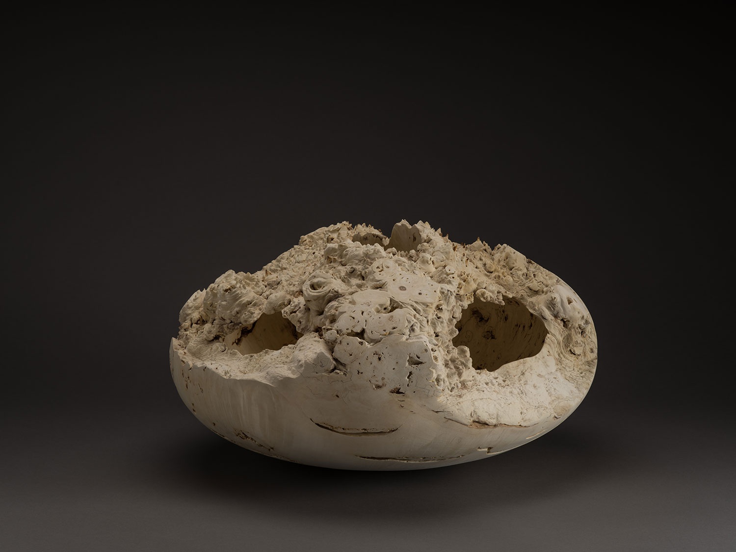 她格外被刺木的有机混乱和创作可能性所启发。数十年甚至数百年以来作为压力反应或愈合机制形成的这种细胞增殖是一种罕见、神秘而美丽的自然行为。树木纹理的扭曲构造、常见的树皮杂质和孔隙挑战着她的工作,使得难以对之挖空塑形,但是树皮的剥离揭示了一个之前从未被人见过的秘密,一片空灵的景色。