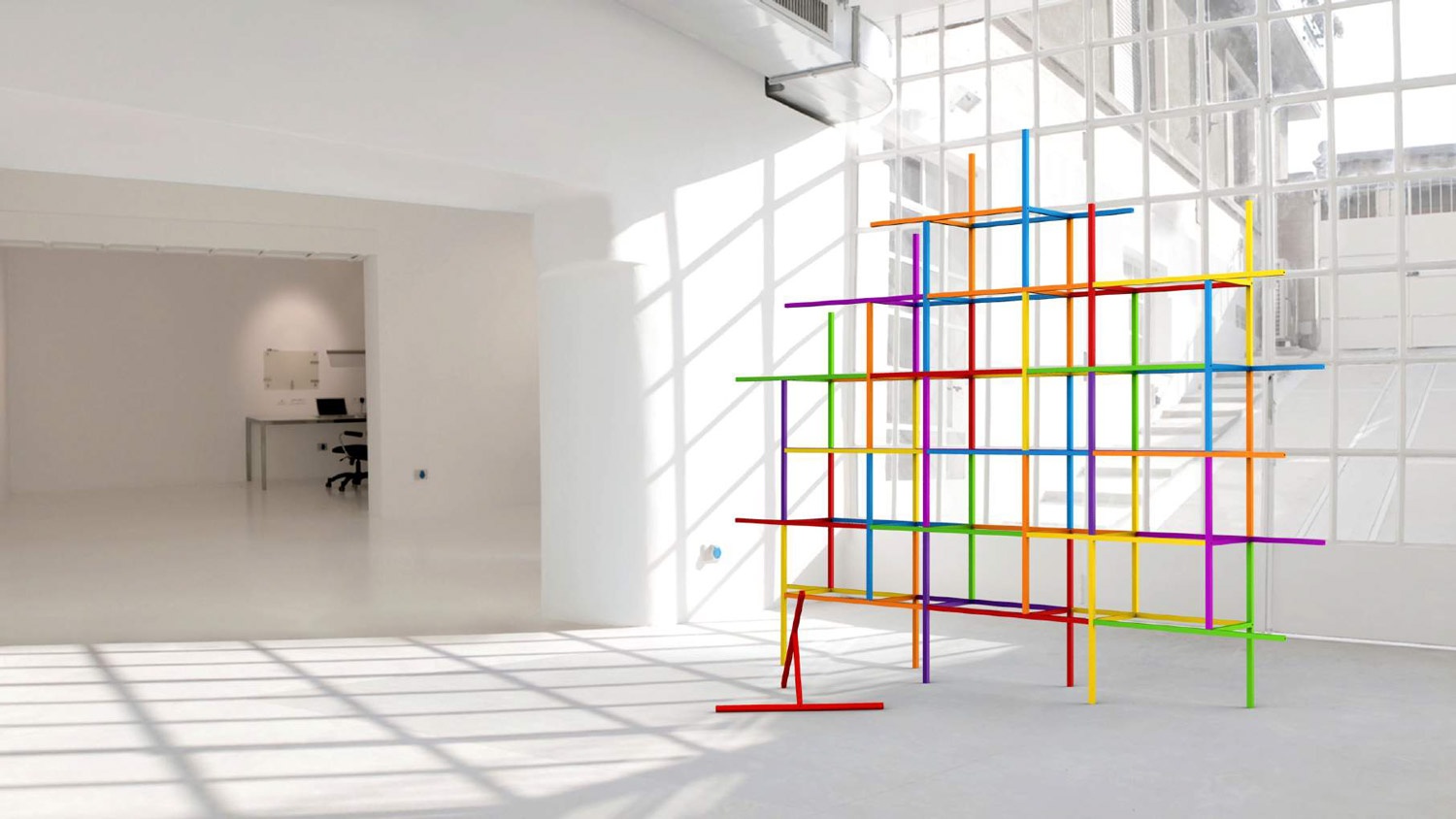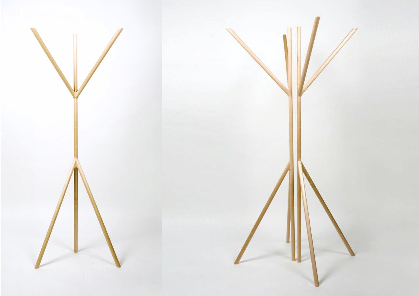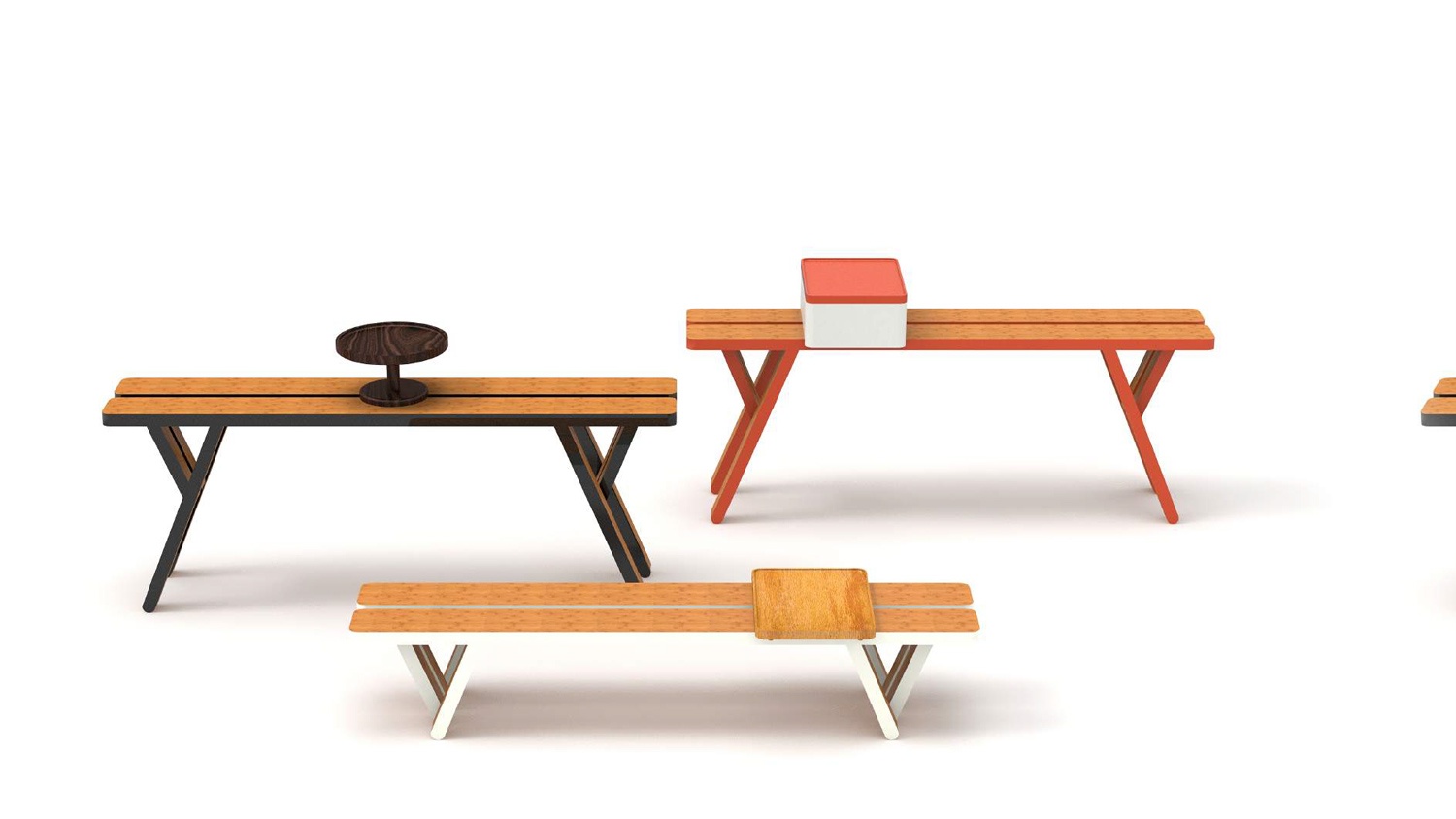 是一套模组化的家具设计,由不同尺寸的木条或竹条组合而成,桌子、椅子,甚至是床都可以由这种结构组合而成。