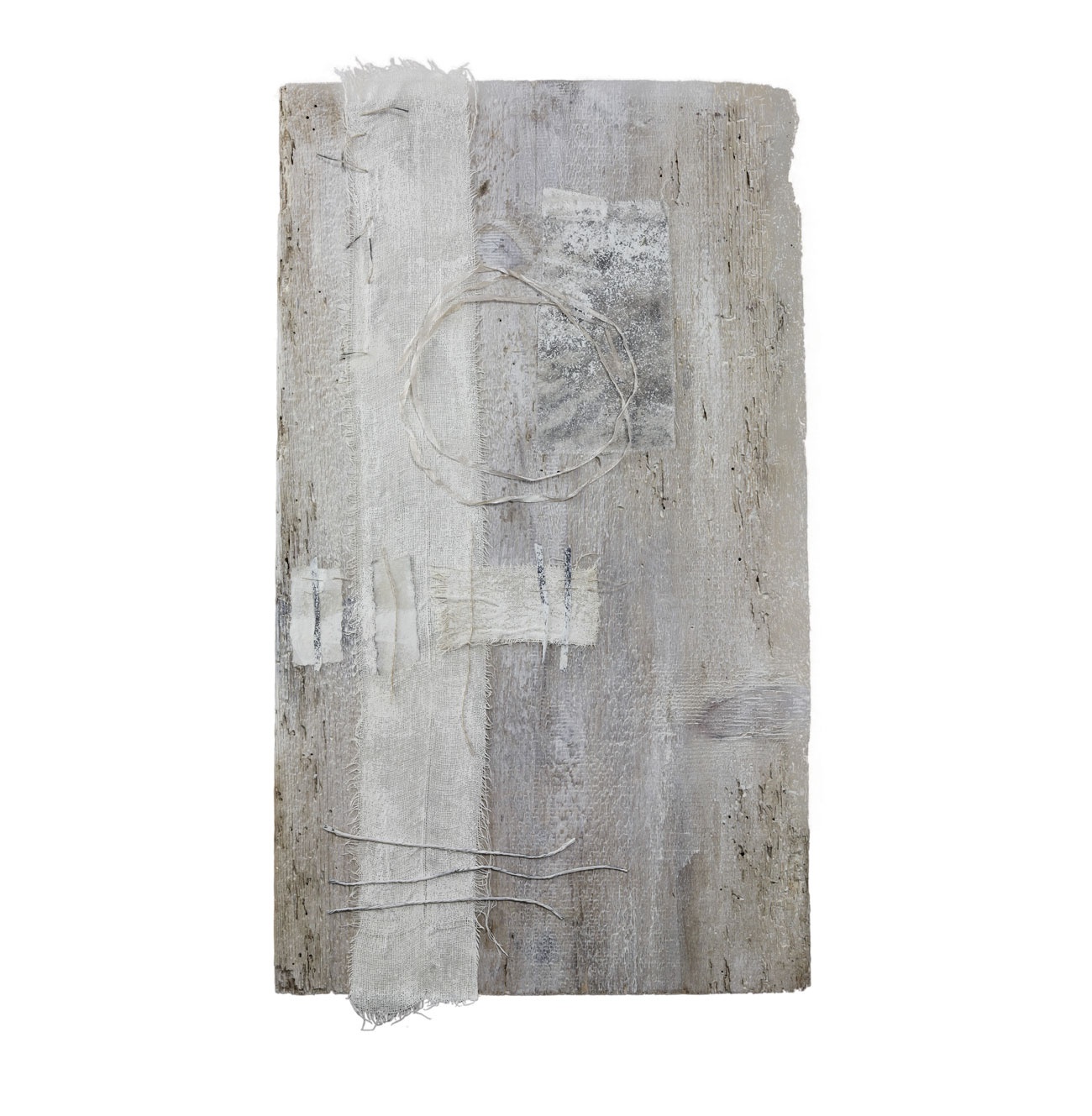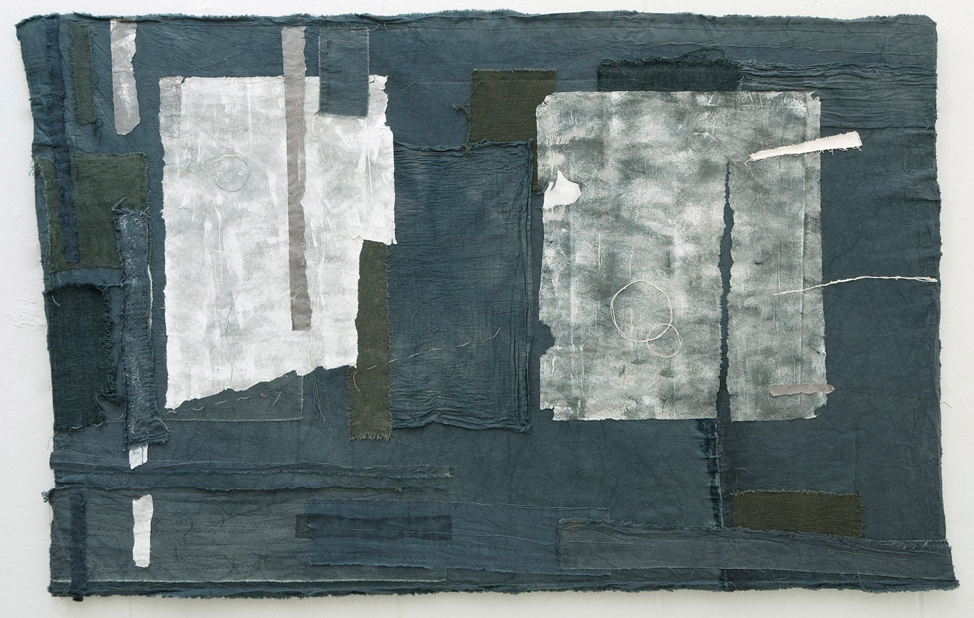 The work has a raw and simple materiality grounded in resonant and sensory experience of place. Layers of detail are revealed or hidden as light and shadow pass across and through surfaces, echoing the transience of emotional and physical landscape. Abstract compositions evolve through the tactile and contemplative process of drawing with paper, cloth and thread. Their making involves a series of ritual processes; wrapping, binding, layering, piercing, knotting, stitching and suturing and burning. The burnishing, staining, abrading, shadowing and marking of surfaces continues the dialogue Gizella quietly has with each piece, and that which it has in relation to others within a series.