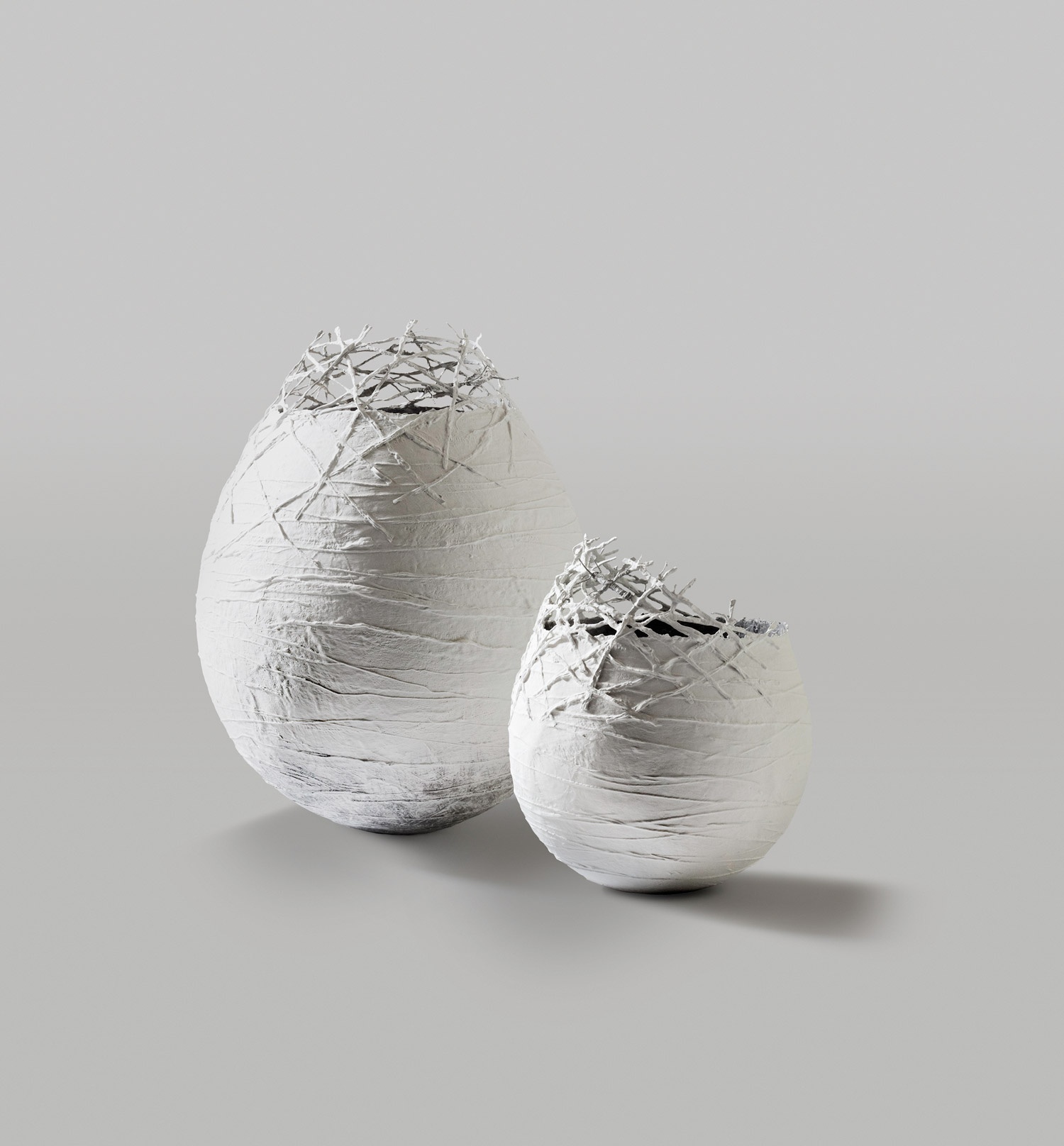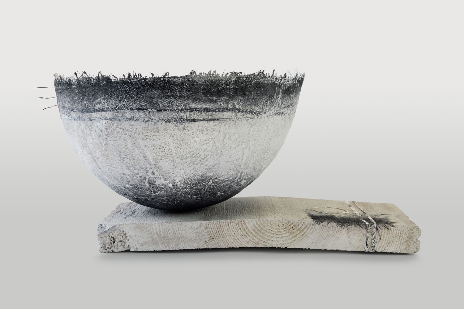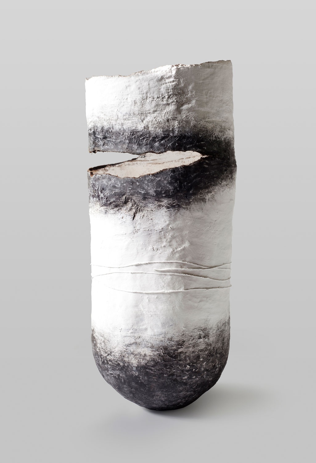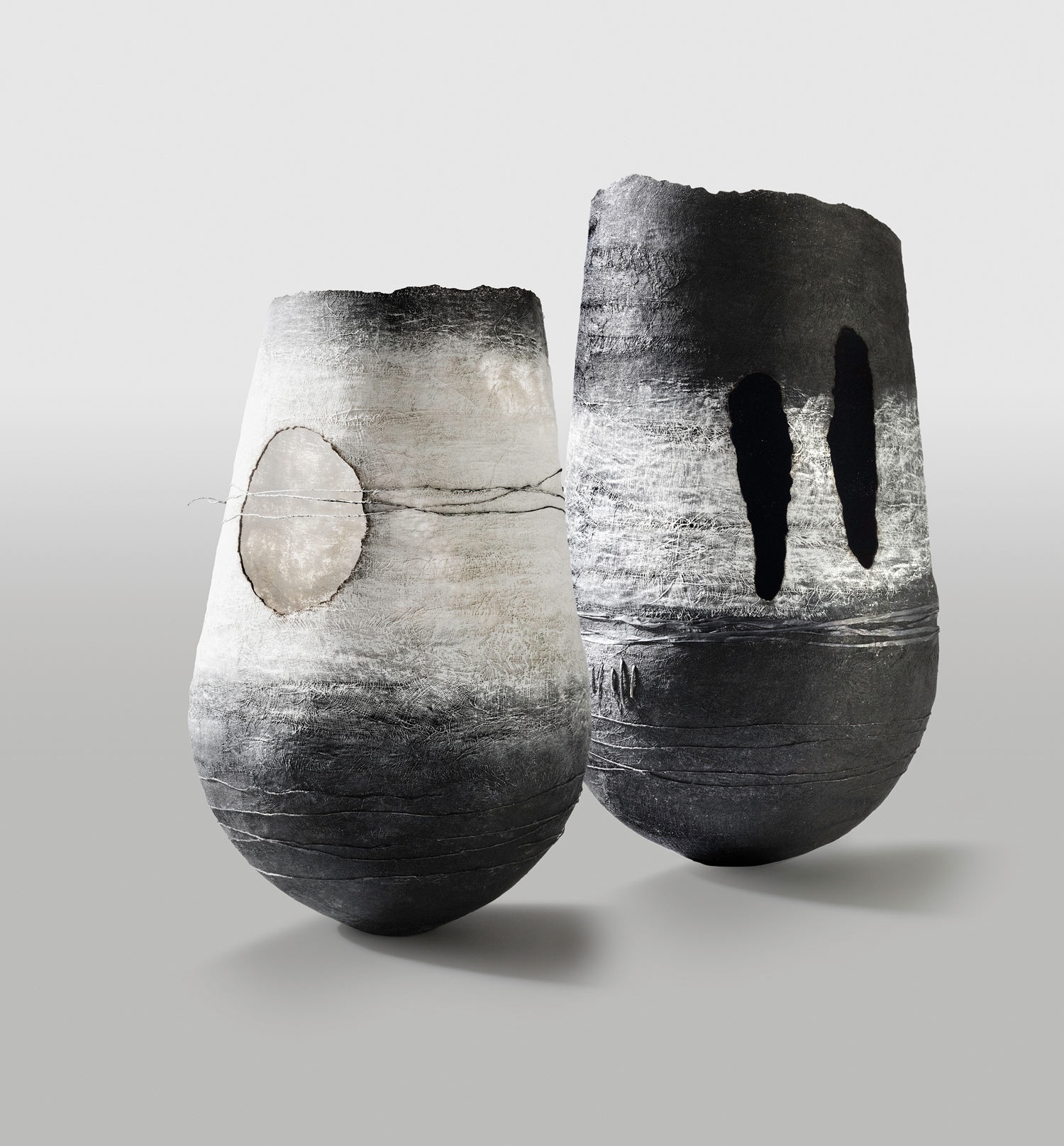 ‘These wrapped and sculpted vessel forms are quietly resonant of internal spaces and external skins, of scarred and fissured surfaces, of abrasions, bindings and sutures.’
