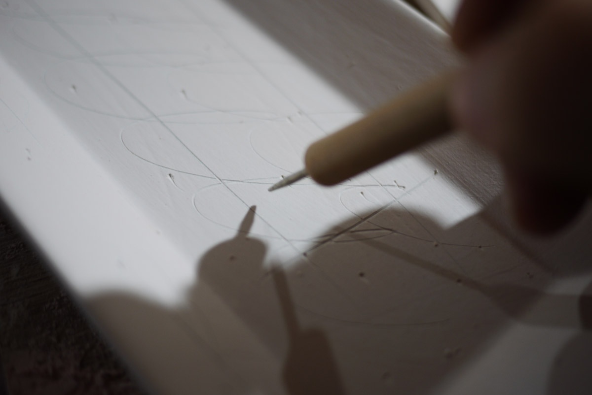 Step 2 - Carve the patterns you like with a needle pen, and this is to plan the space for blue and white material later.