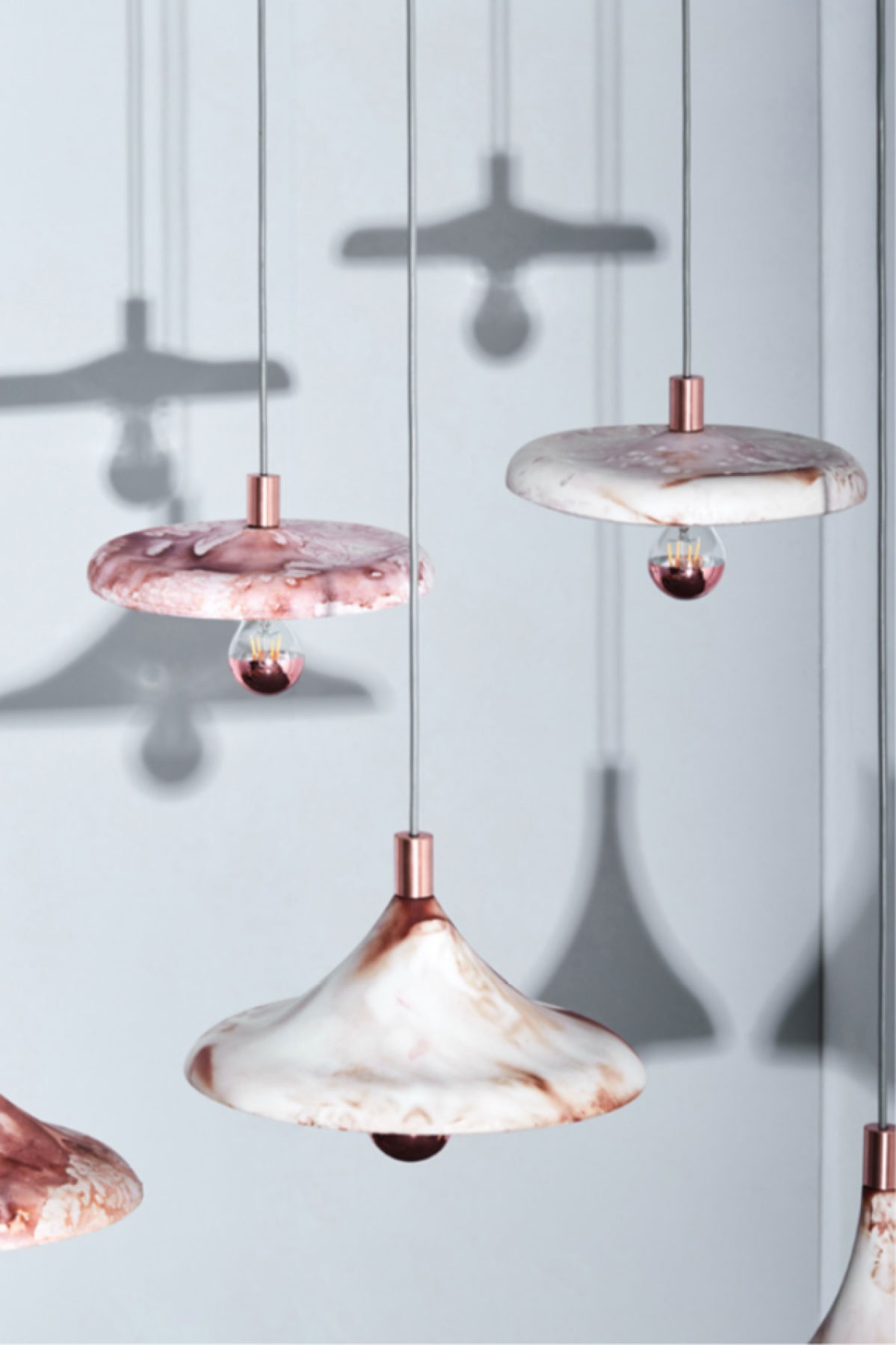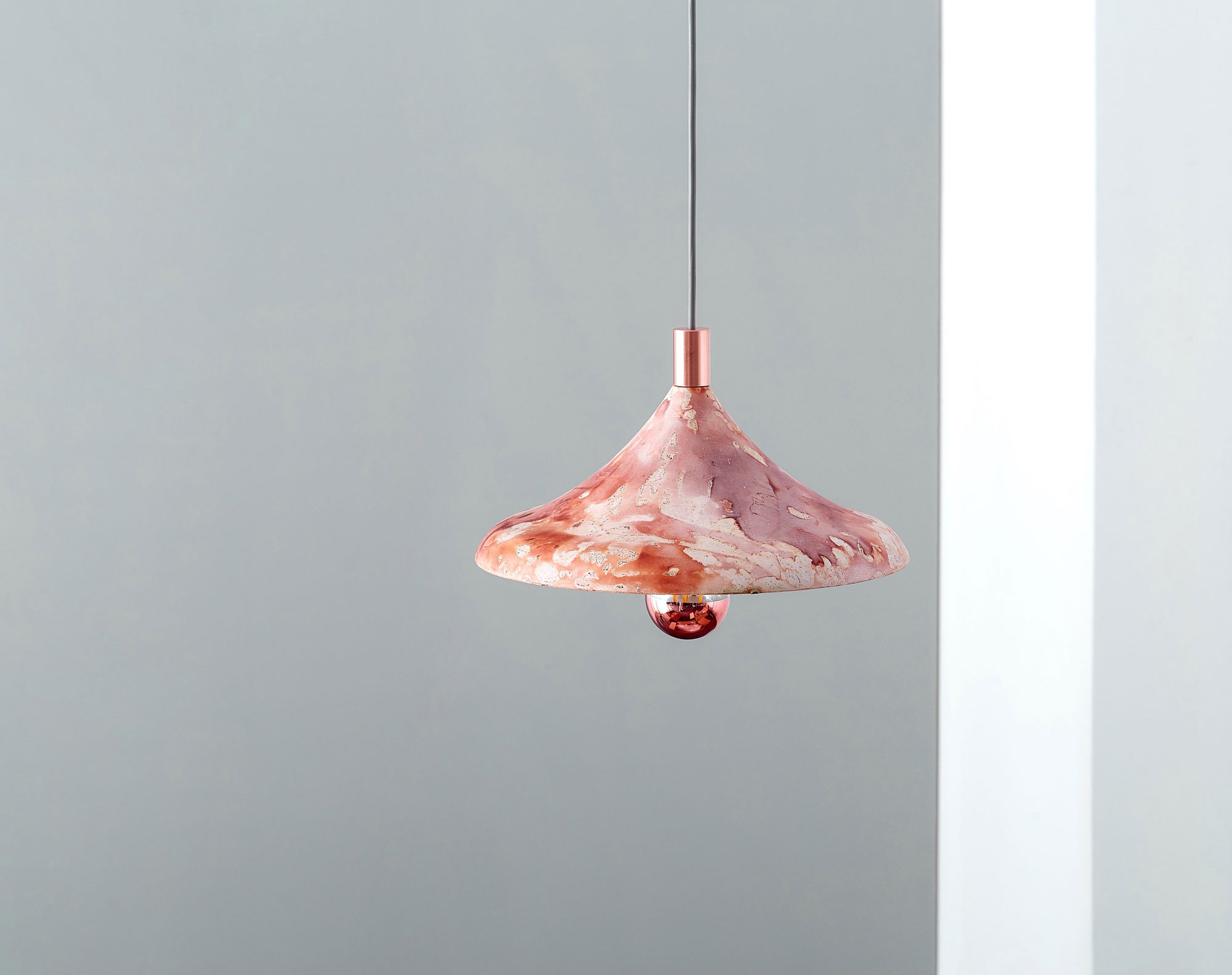 Coffire is the lamp collection we created using a special colouring technique inspired by ancient pit firing. During low temperature firing at between 700 and 1000 degrees Celsius, coffee grounds would release biodiesel and sugar, which react and create a random reddish pattern on the ceramic surface as a result of multiple variables including temperature, humidity, and coffee grounds density.