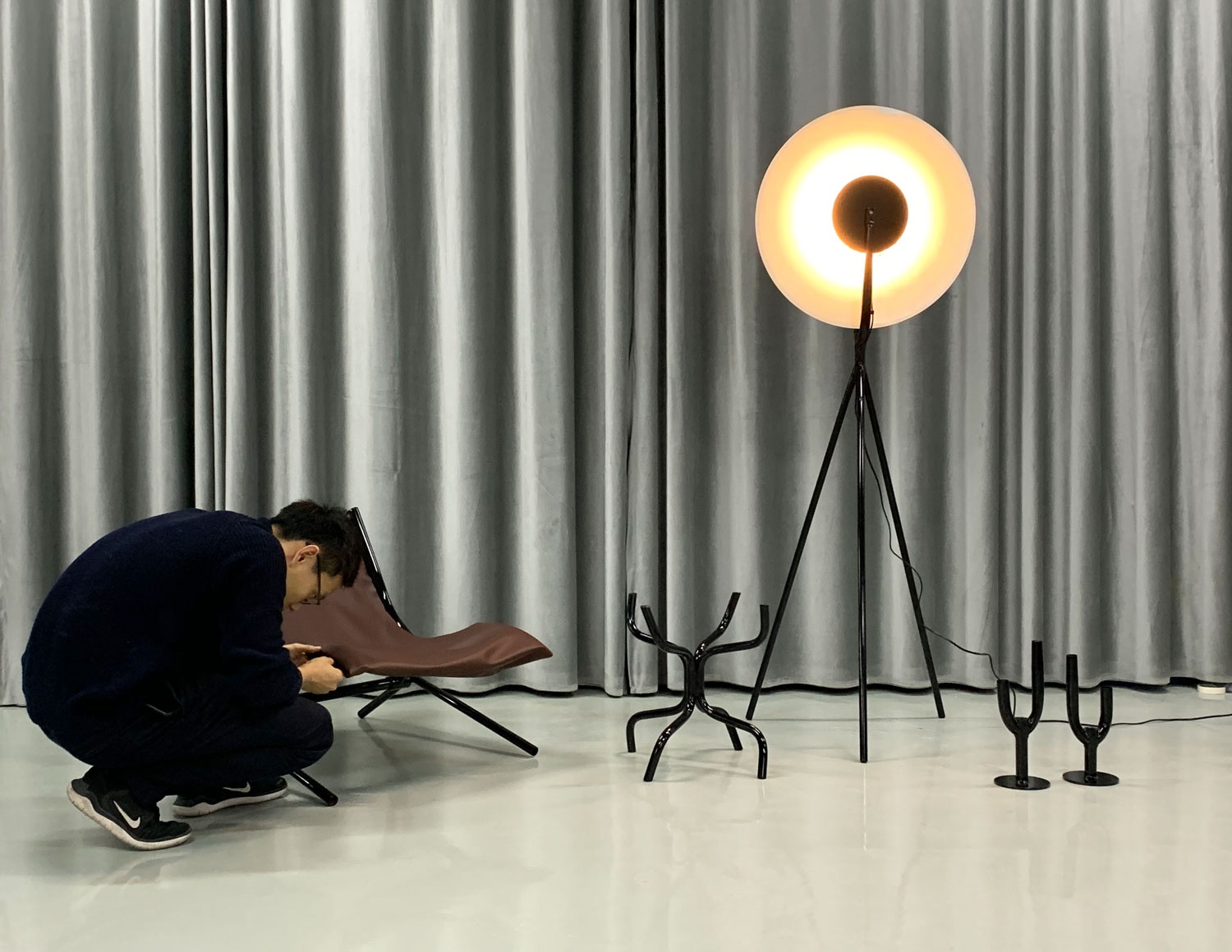 立灯:光源支撑部件其实来源于单车轮胎的固定件—前叉。在拿到这个单车部件的时候,我们发现原本刹车线的位置可以变为灯具电源线的固定位置,于是这款立灯应运而生。
