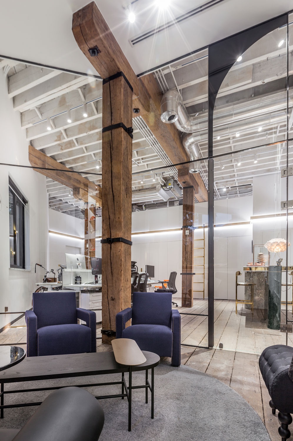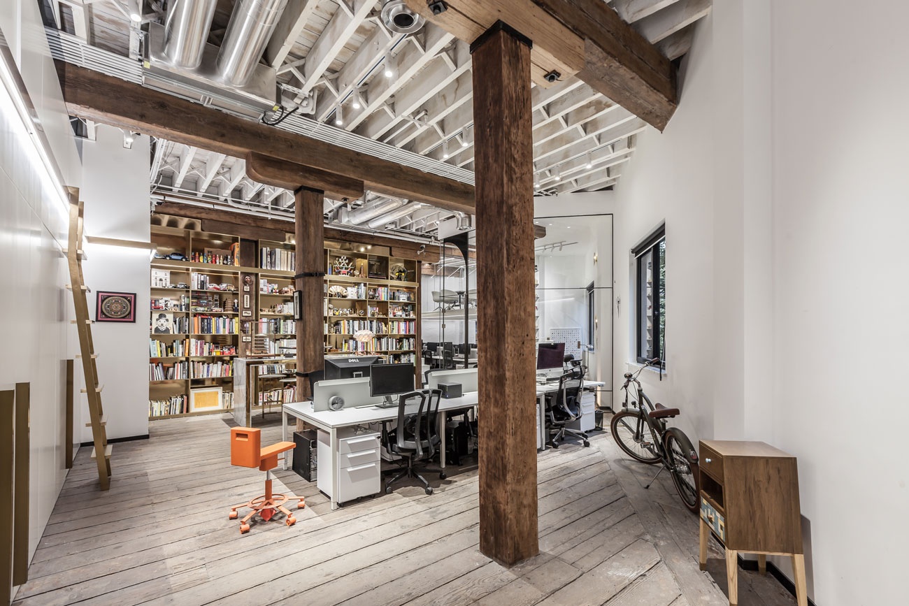 如果说建筑外部是对于历史的还原,而其位于粮仓二楼的NONG STUDIO工作室则是将摩登诙谐演绎的淋漓尽致。在设计时,刻意将入口区域压暗,全黑的空间给来访者一种“距离感”,但随着电动移门的逐渐打开,便是豁然开朗的4米5挑高明亮开放办公空间,空间中保留并裸露的百年原结构木梁木柱和木地板是一场与历史的邂逅,我们小心翼翼的将其保护并加固处理,随着脚步的移动,来到最后的三角区域,夹层的设计让空间的使用率达到最高,从入口到内部,空间的节奏也呈现出收-放-再收的韵律感,在材质使用上,除了对于百年历史木结构的保护,运用黄铜、玻璃、大理石、不锈钢等现代材质,将历史与摩登在这个空间中自由的对话。