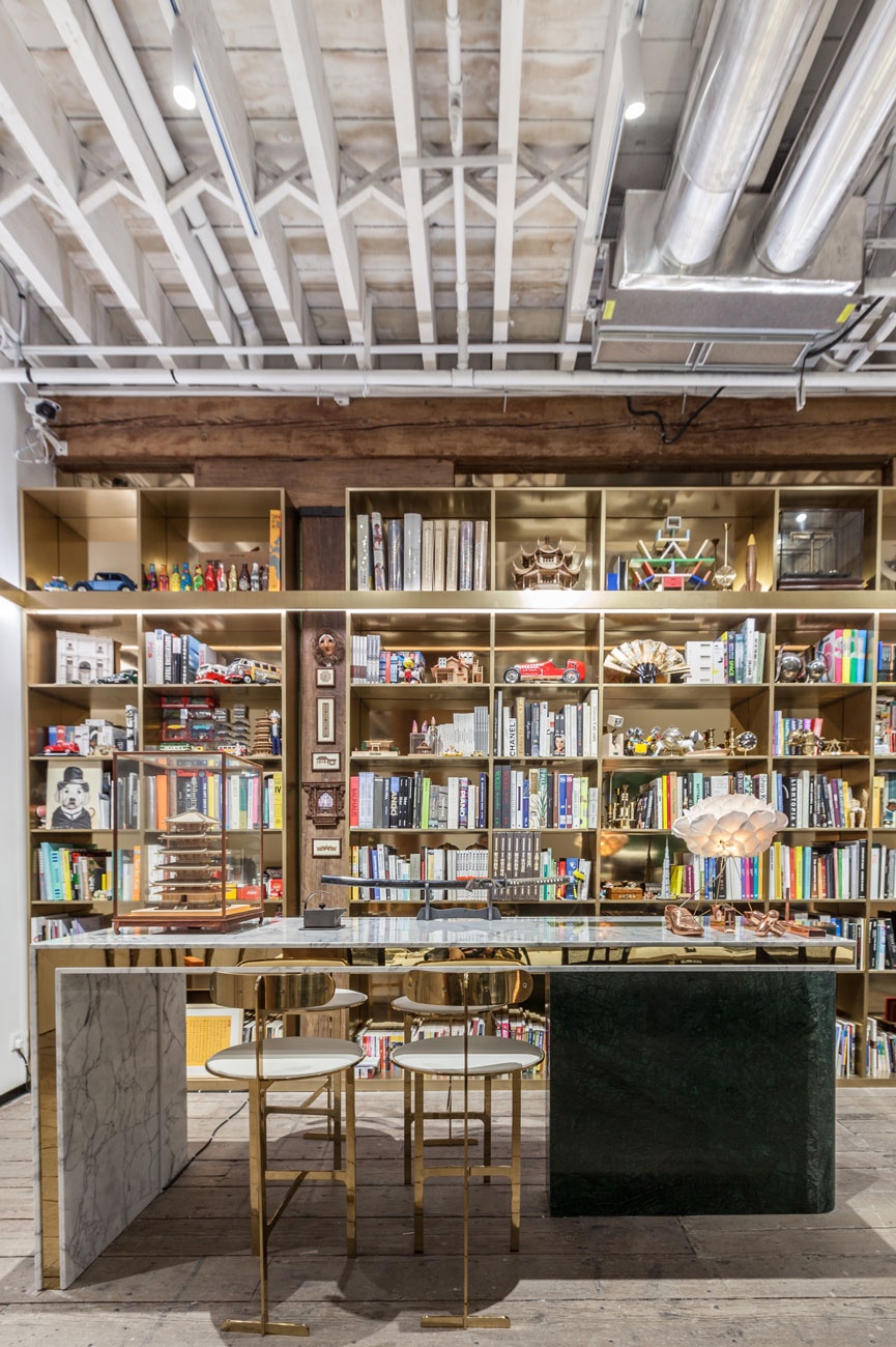 回到体块功能的设计上,NONG STUDIO 并没有以传统办公中的私密层级或者效率层级来组织空间,而是以互动的可能层级来安排空间,主创办公空间安排在进门区域,围绕其是辅助的材料空间,会客空间,金色书架,和图纸讨论区,类似图书馆的空间逻辑,工作区位于中间,书架素材区围绕,使得主创工作空间成为一个信息处理枢纽,增加互动的可能性。其中,金色的书架是你进入空间后无法避免的空间亮点,其设计理念来自于中国古语中的“书中自有黄金屋”的概念,里面展示了国内外与设计艺术有关的各类书籍和创始人汪昶行在全世界五十多个国家旅游带回的古董,玩具,设计品,乐高模型等收藏。可移动的金色书架将主创办公区挑高的二层空间有效串联起来,既方便取阅较高区域的书籍,又方便利用二层储物空间;另一面收藏架是会议室的白色不锈钢展示架,可以说是一部现代工业设计史,满墙的VITRA大师椅缩小版,限量的车模和大师签名艺术品。这两面通高展示架定义了会客空间,楼梯交通空间,和主工作室办公空间。一实一虚,后者为玻璃展面,既分隔了会客室,一楼集合办公,二楼大会议室的空间;又创造了视线上的贯通与交流,虚实背后是对于空间模糊性的探讨。