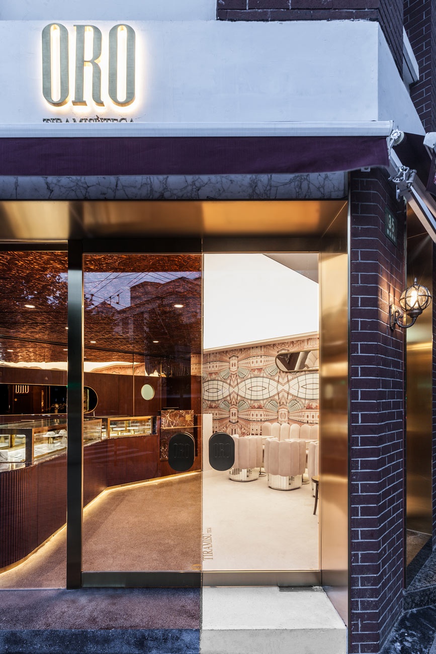 所有空间的大理石拱门设计,或绿色,或粉色,或橘色,都让整个空间有一种厚重的体量感,但周围的金色镜面不锈钢支架,墙面上渐变玻璃,又相对地缓解了这份“压迫感”,漫步其中,仿佛把你带入二十世纪中叶的欧洲庭院。