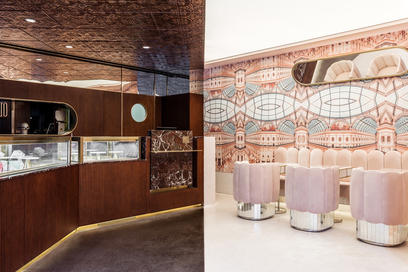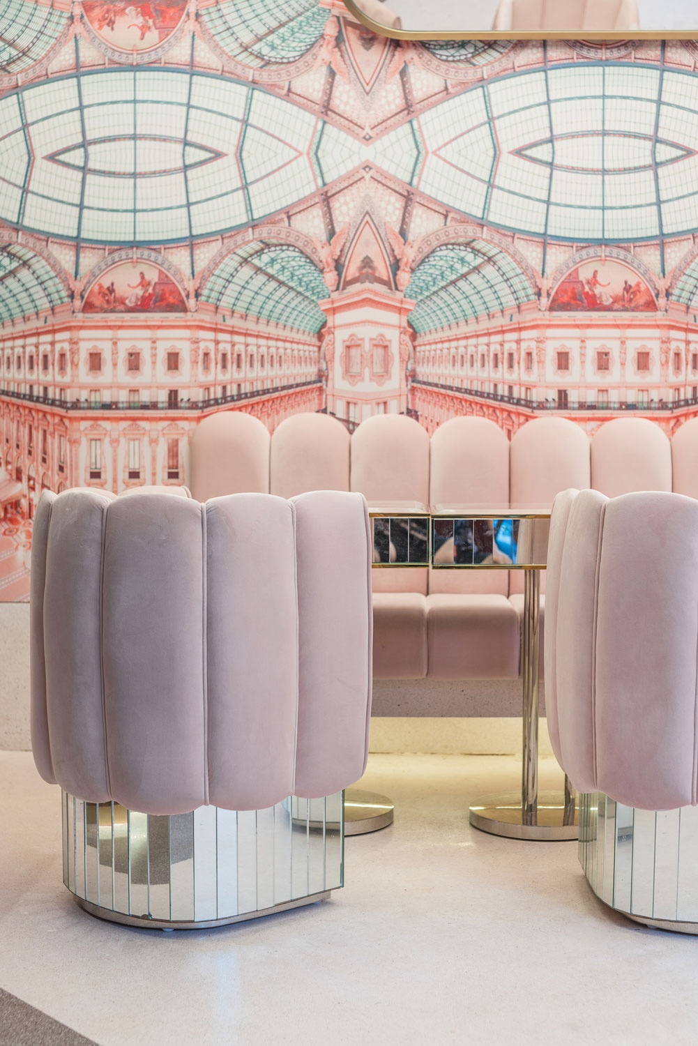 这个源自于意大利的品牌的店铺坐落于上海法租界,店铺的设计是一场空间与时间维度上的蒙太奇——链接着传统与摩登,过去与现实,历史文化与商业喧嚣——一条清晰的分割线沿对角线将店铺分成两块。一面带你步入20世纪中后叶的米兰,棕色胡桃木饰面,深褐色水磨石地面,黄铜,雕花吊顶,仿佛一场穿越回到后现代的米兰。而另外一边,与之相对应的是画着米兰著名的让努维尔二世拱廊的粉色墙纸,丝绒的粉色软包,粉色的水磨石地面,镜面和发光灯膜吊顶。所有材料和质感上的对比都隐喻着复古与摩登的品牌内涵。